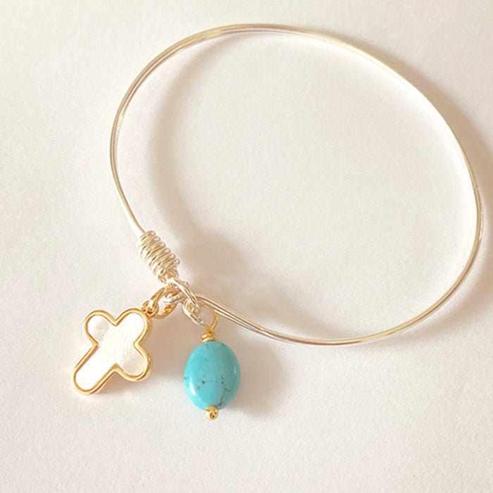 La pulsera cruz oro y nácar destaca en la muñeca por su elegancia, su brillo, su ligereza. Le puedes añadir una piedra semipreciosa para darle un toque de color.