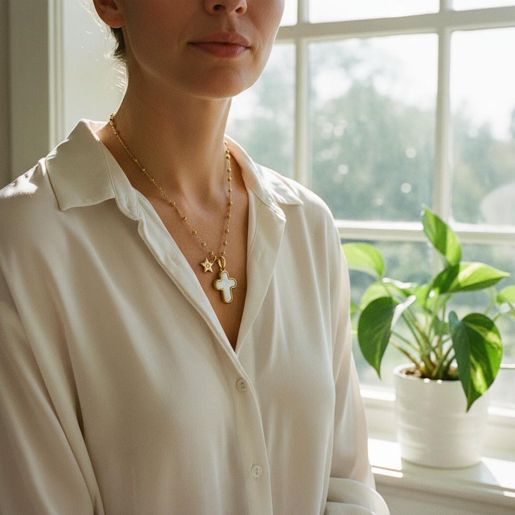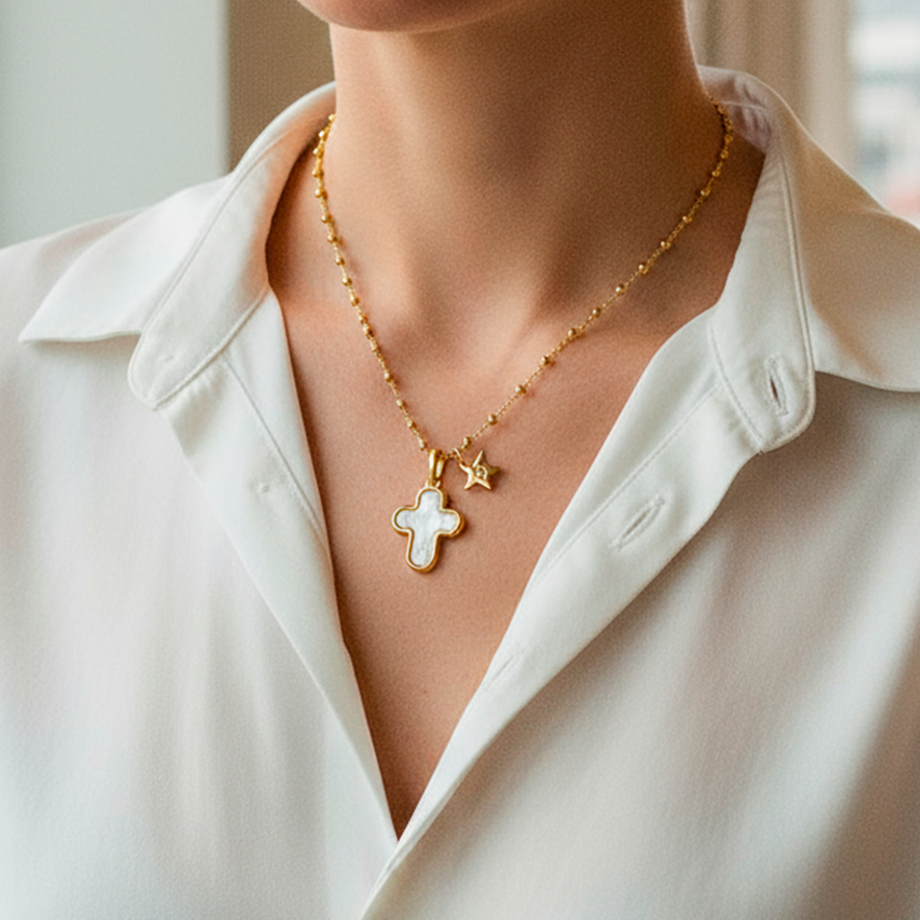 El collar religioso cruz nácar y oro es una preciosidad. Puedes personalizarlo grabando una inicial en la pequeña medalla adicional. Es el regalo perfecto para una comunión o un bautizo.