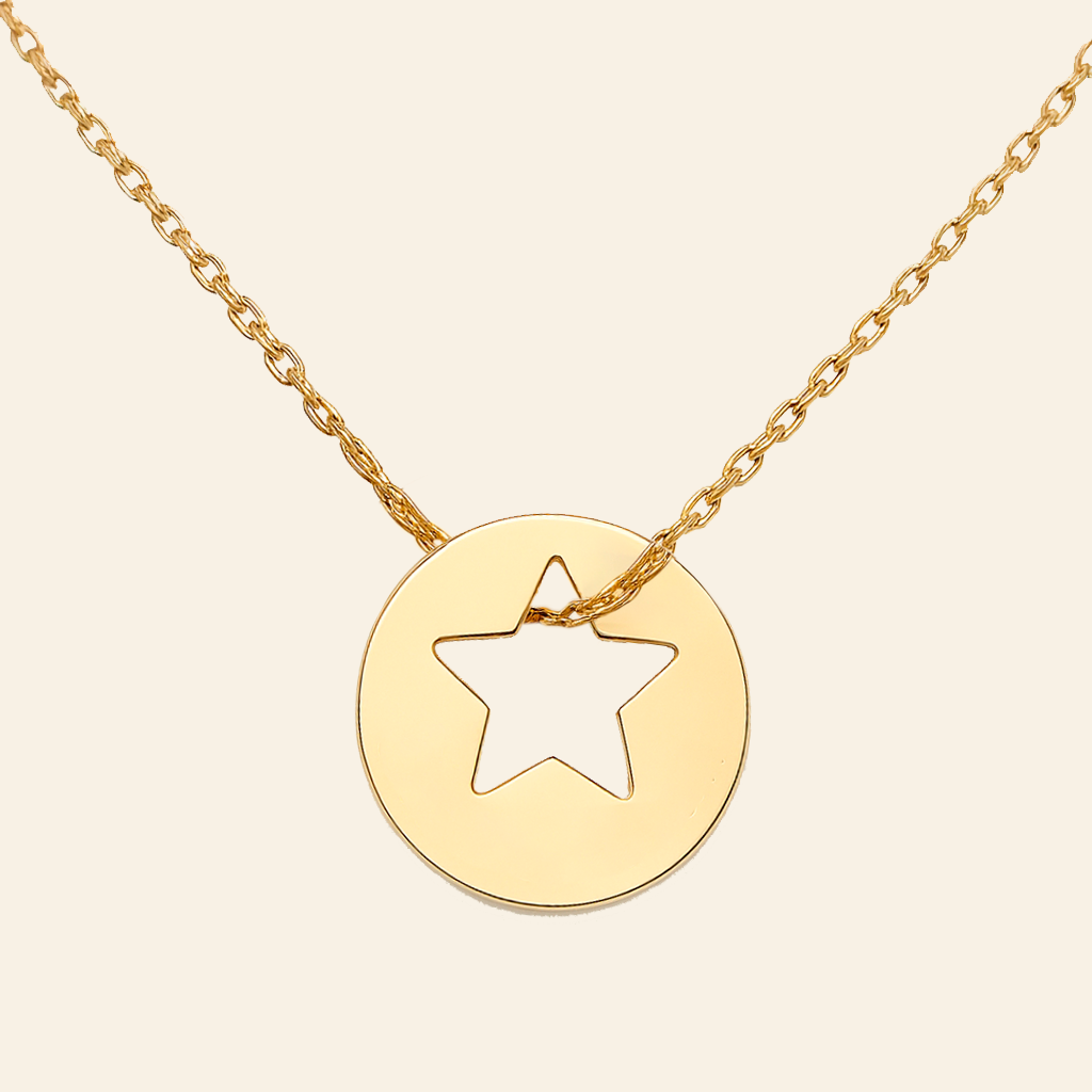 Su medalla redonda calada con una estrella de cinco puntas puede grabar nombres, fechas o palabras especiales en el anverso y reverso, creando una joya totalmente única. Cada grabado se realiza a mano, aportando un acabado artesanal y exclusivo.