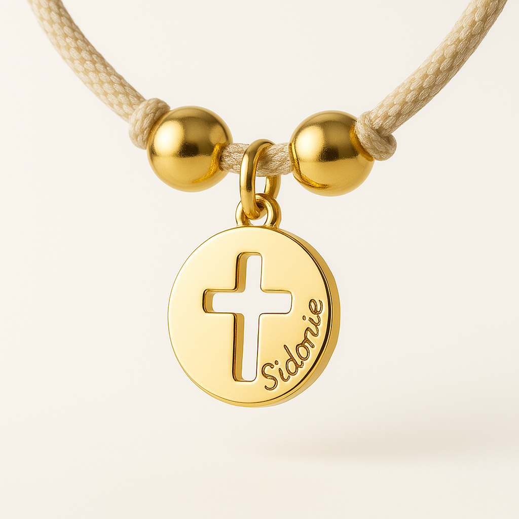 El Collar religioso medalla redonda con cruz calada personalizada con cordón es una joya pequeña, discreta y llena de encanto. Puede grabar un nombre, una fecha o una palabra especial, convirtiéndose en un recuerdo único y emotivo. Es el regalo perfecto para comunión, confirmación, bautizo, cumpleaños, Navidad o Reyes.