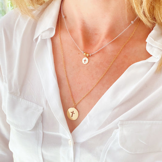 Collar Personalizable Colgante Cruz Calada redonda pequeña cordón